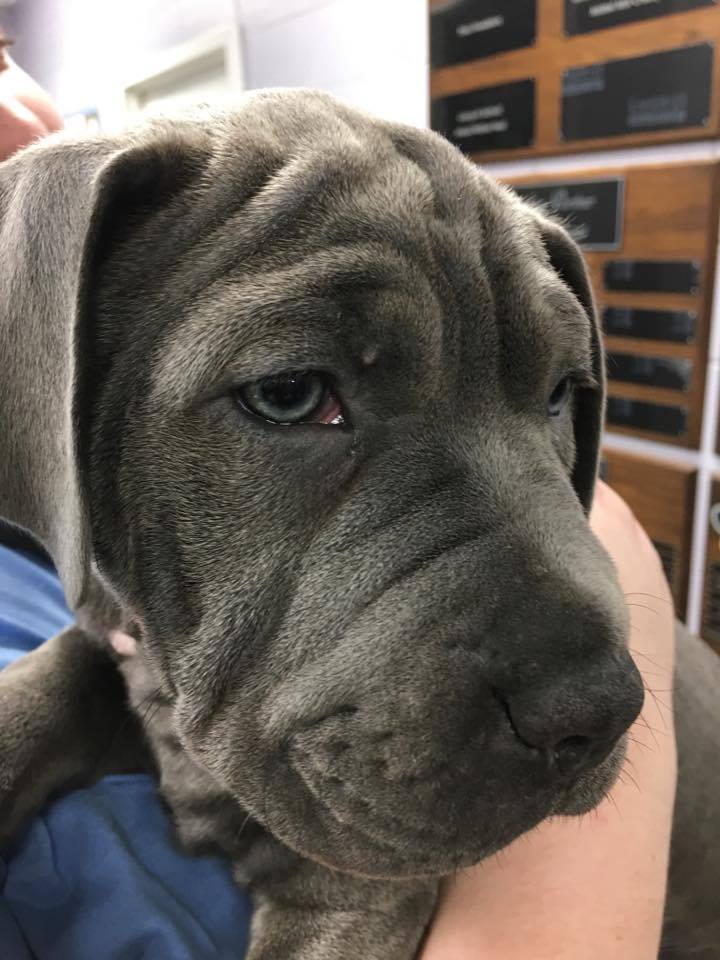 Mercury was definitely the biggest puppy in a large litter of grey pups. Most of them were sleeping in a dog pile in the corner of their enclosure. The big, solid grey puppy waddled over to the middle of the cage, and looked up at me. His eyes!